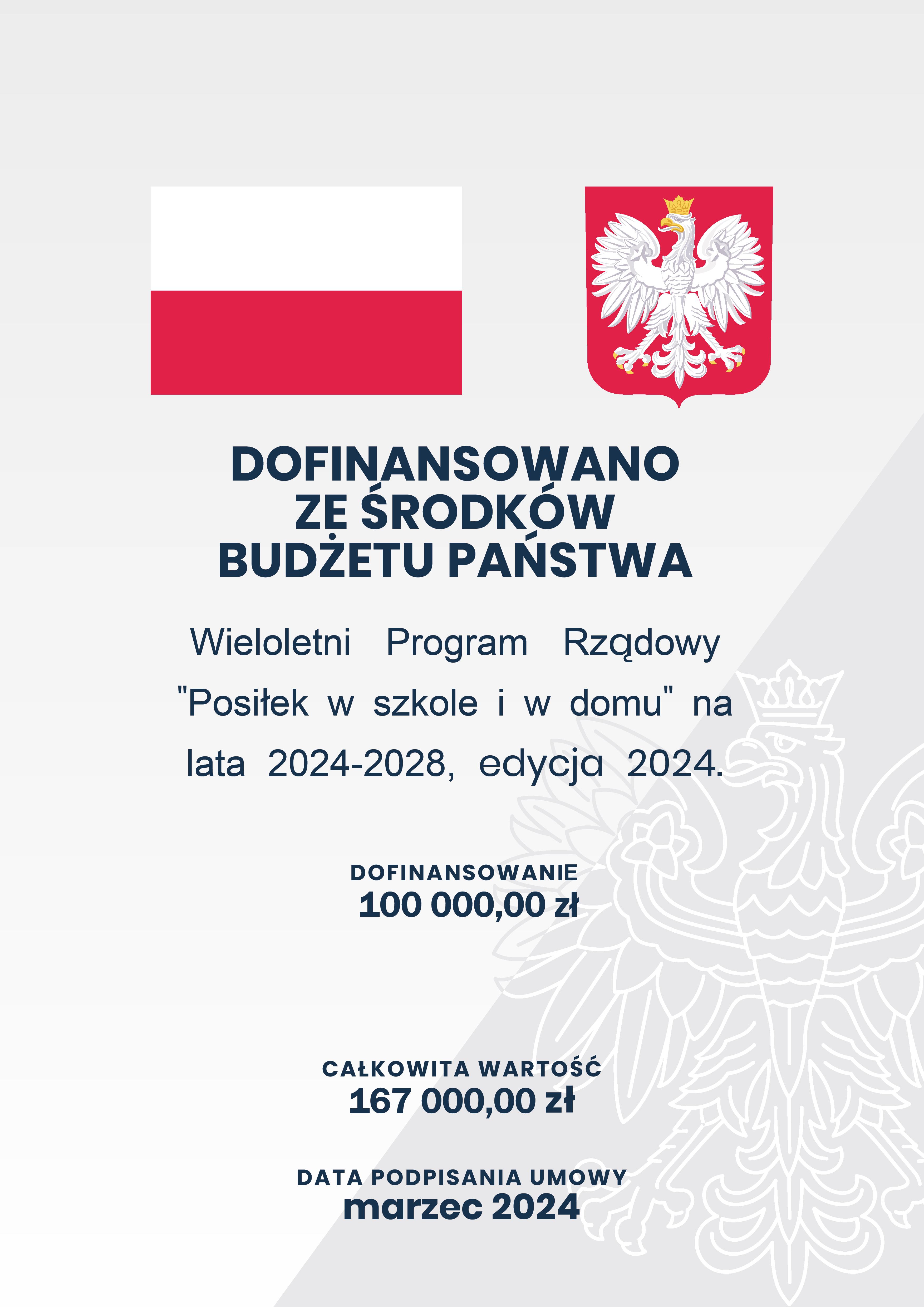 W 2024 roku Gmina Wręczyca Wielka na realizację wieloletniego rządowego programu „Posiłek w szkole i w domu” otrzymała dofinansowanie w kwocie 100 000,00 zł. Całkowita wartość zadania 167 000,00 zł.
